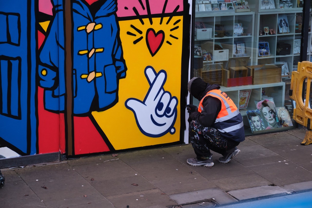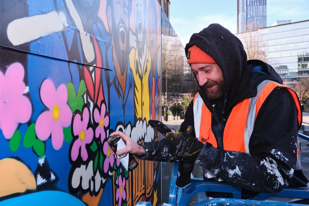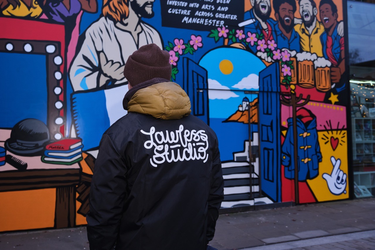 Man looking at brooklyn bridge and new york city skyline.