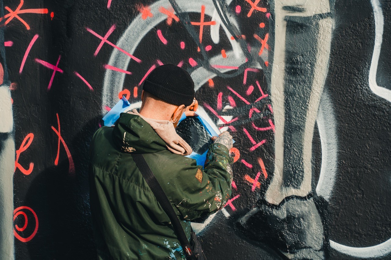 Man looking at brooklyn bridge and new york city skyline.