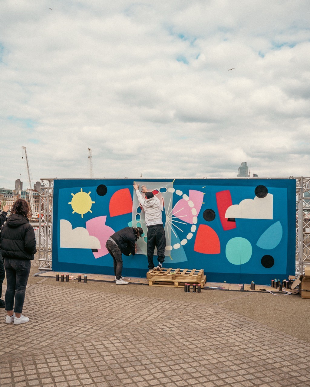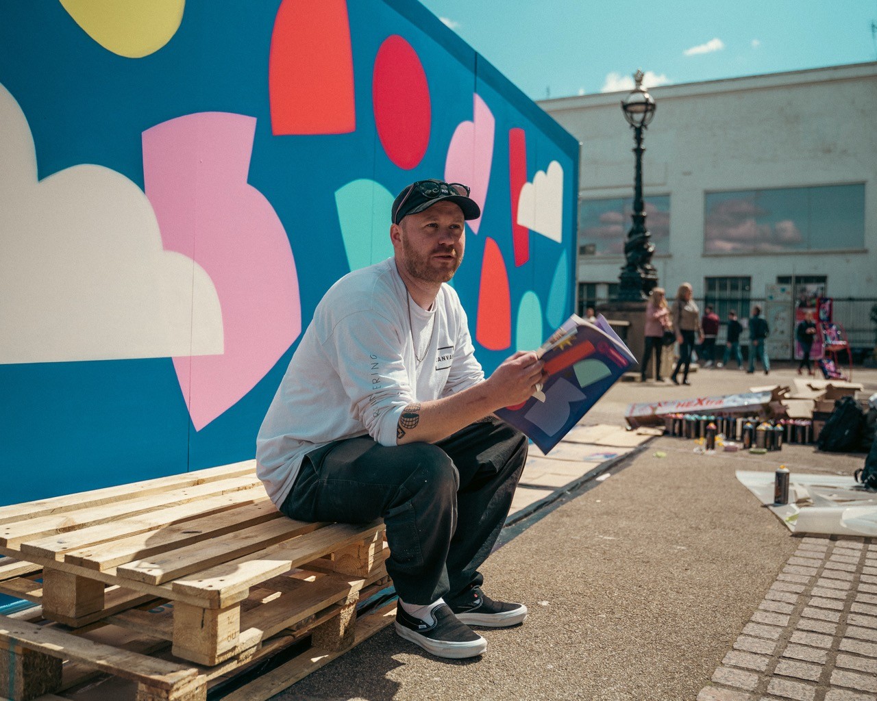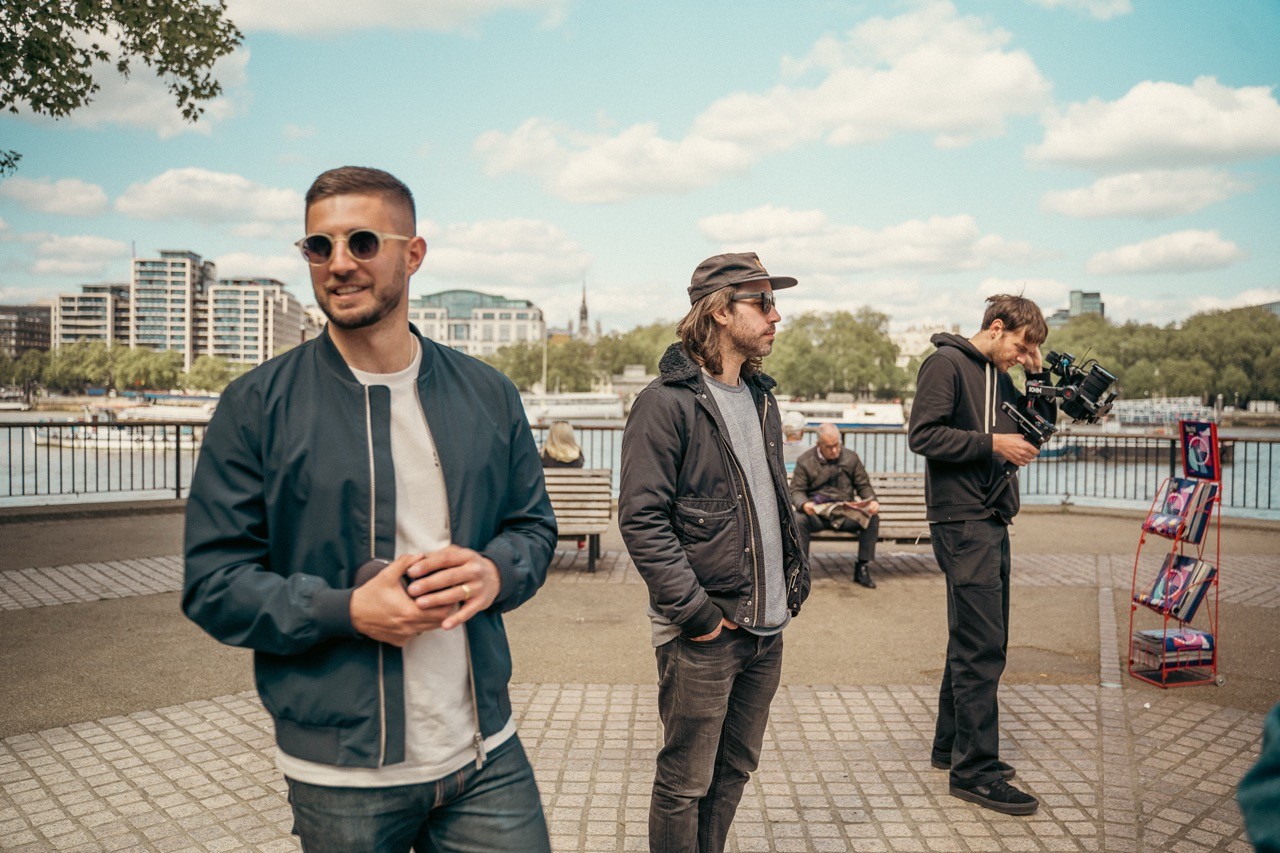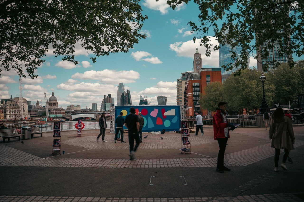 Man looking at brooklyn bridge and new york city skyline.