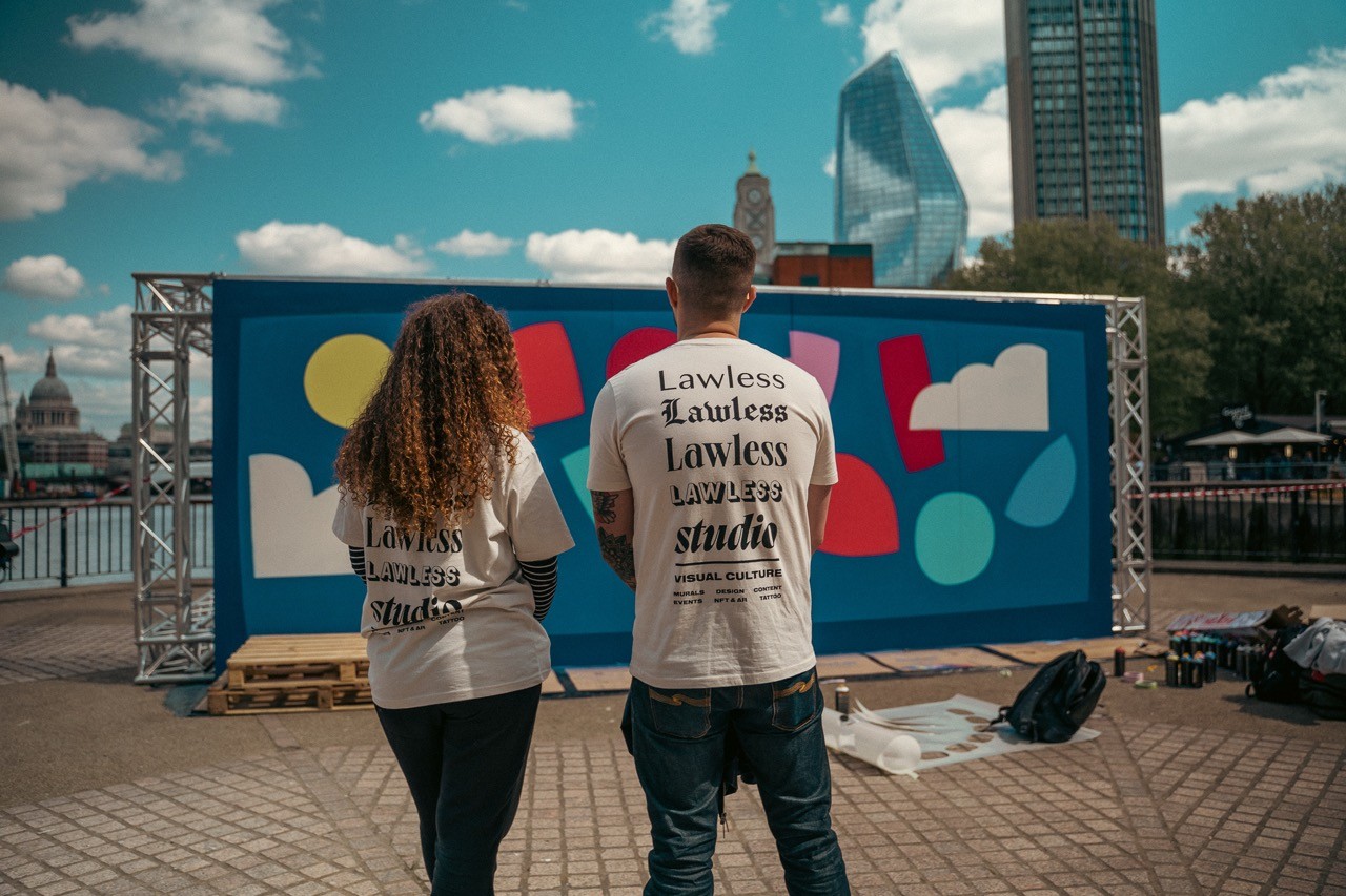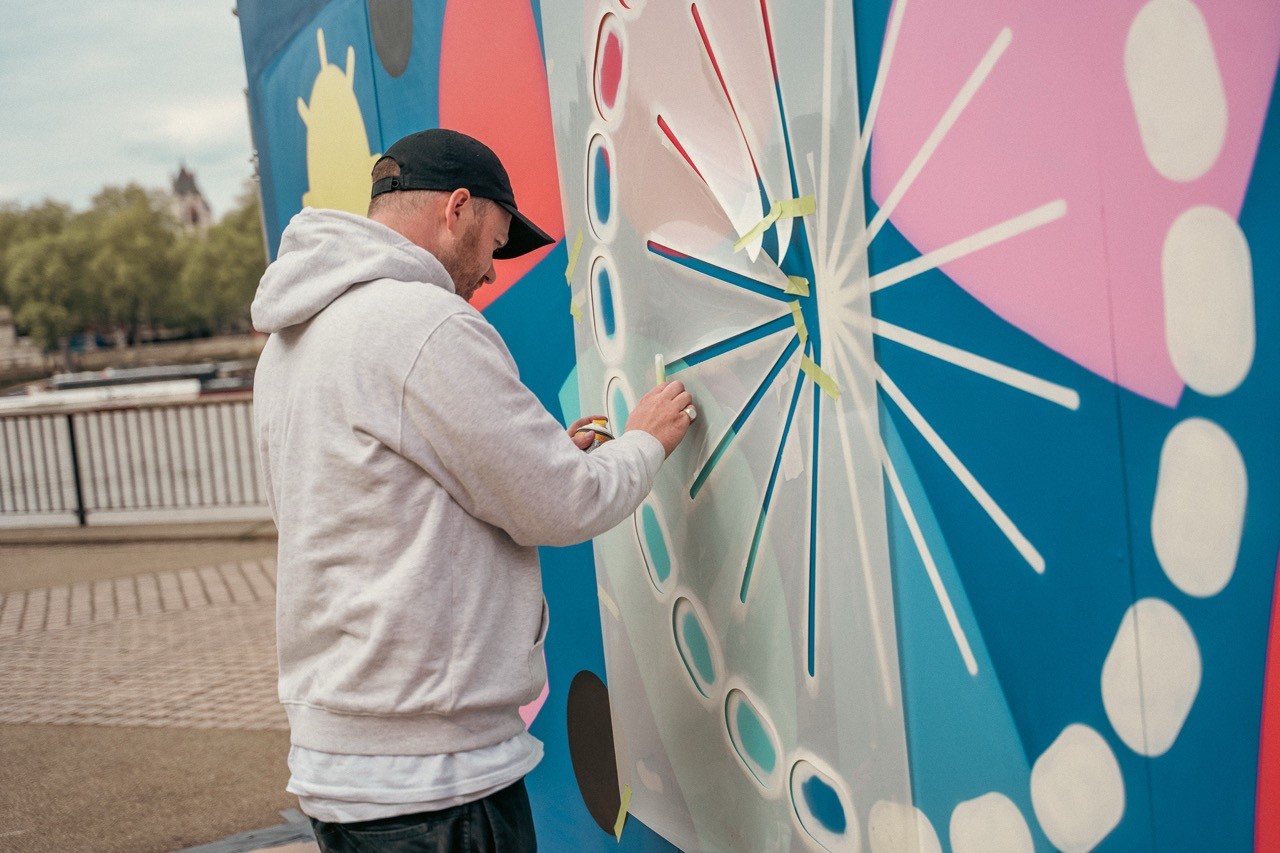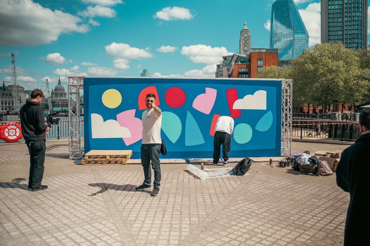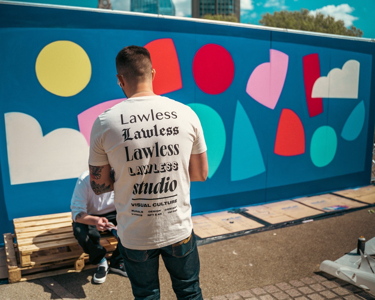 Man looking at brooklyn bridge and new york city skyline.